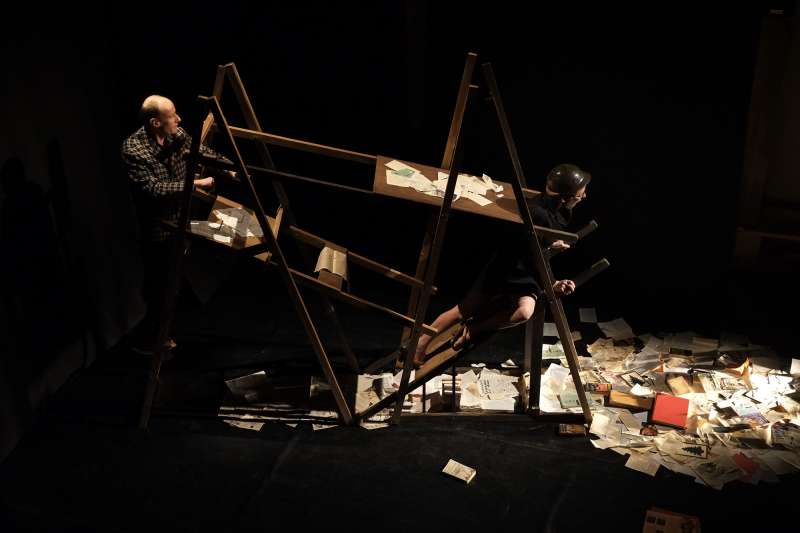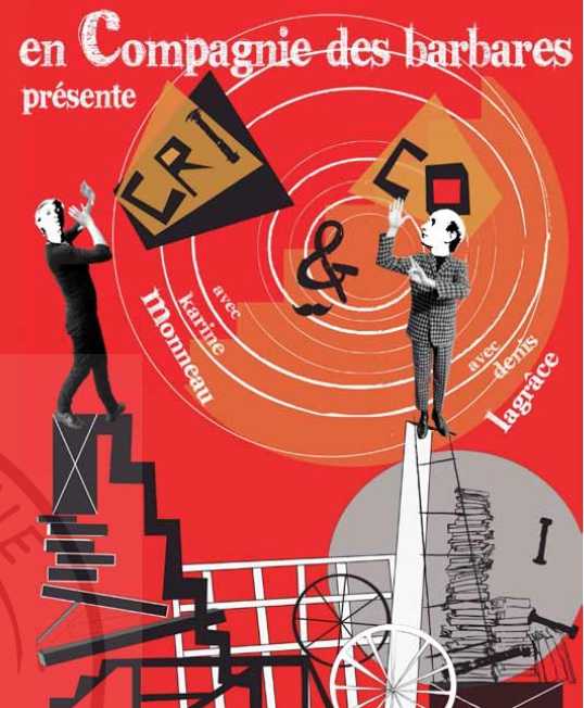 Cri & Co, c’est le retour du loufoque et de l’esprit Dada dans nos vies. Un spectacle pour devenir poète, pour retrouver les poètes enfin mêlés : les savants et les profanes, les contemporains et les disparus : Baudelaire, Mallarmé, Gainsbourg, Tzara, Desnos, Maquet… Le tout présenté par deux personnages intemporels : Monsieur et Madame Dupont, figures clownesques et asymétriques. Dans un décor fait de collages, de bibliothèques déstructurées derrière un mur de livres, allongés sur une machine à accoucher du texte, ils inventent mille jeux surréalistes pour nous faire rire et relire. Cri & Co est un spectacle co-écrit, truffé de citations de poètes disparus et autres cadavres exquis.